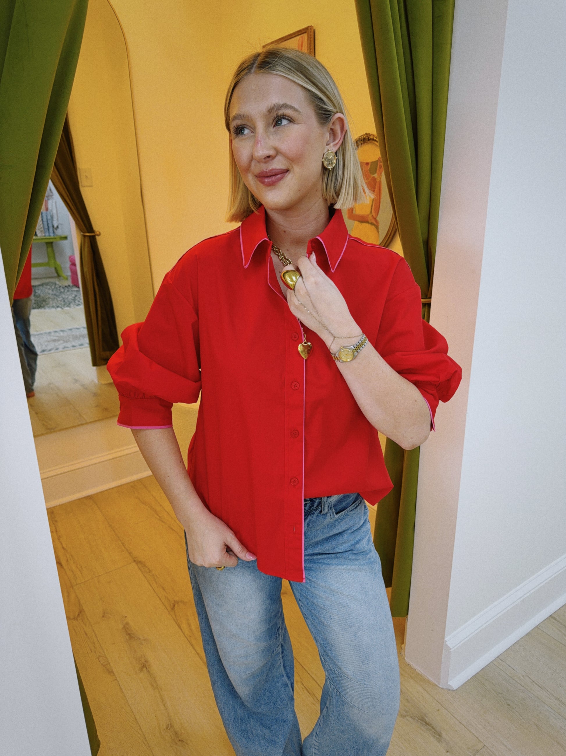 The ultimate statement red top! This button-down features a relaxed fit with a crisp collar, subtle contrast trim, and the cutest puff sleeves for that elevated touch. Easy to dress up or down, it pairs perfectly with denim for a bold everyday look or styled for a night out.